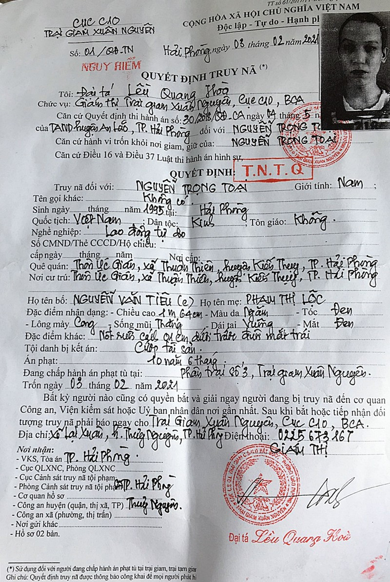 Ngày 3-2, lợi dụng sơ hở của trại giam, Toại trốn trại và đón xe vào TPHCM. Ngay trong ngày, Trại giam Xuân Nguyên đã phát lệnh truy nã toàn quốc.