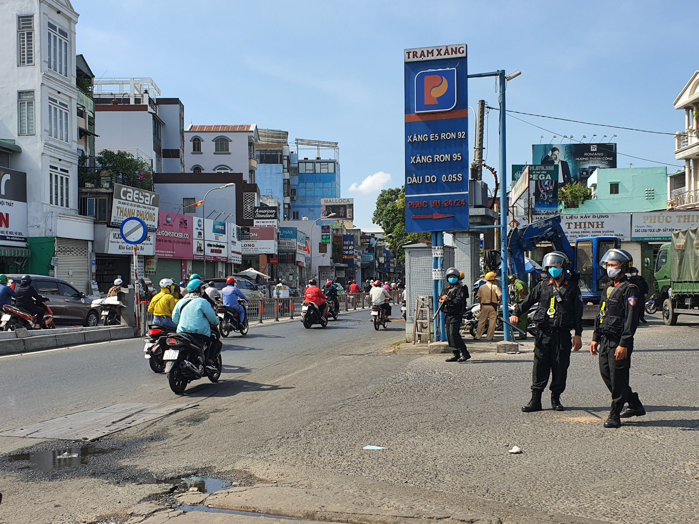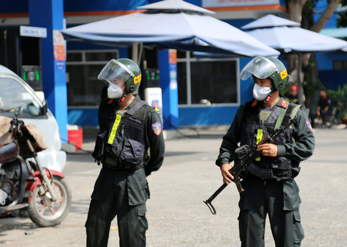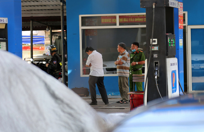 Sáng 25/3, hàng chục cán bộ chiến sĩ Cảnh sát cơ động tỉnh Đồng Nai phối hợp cùng C03-Bộ Công an, Công an quận Gò Vấp, TPHCM đang phong tỏa, làm việc tại cây xăng dầu số 1, đường Nguyễn Kiệm (phường 3, quận Gò Vấp, TPHCM).