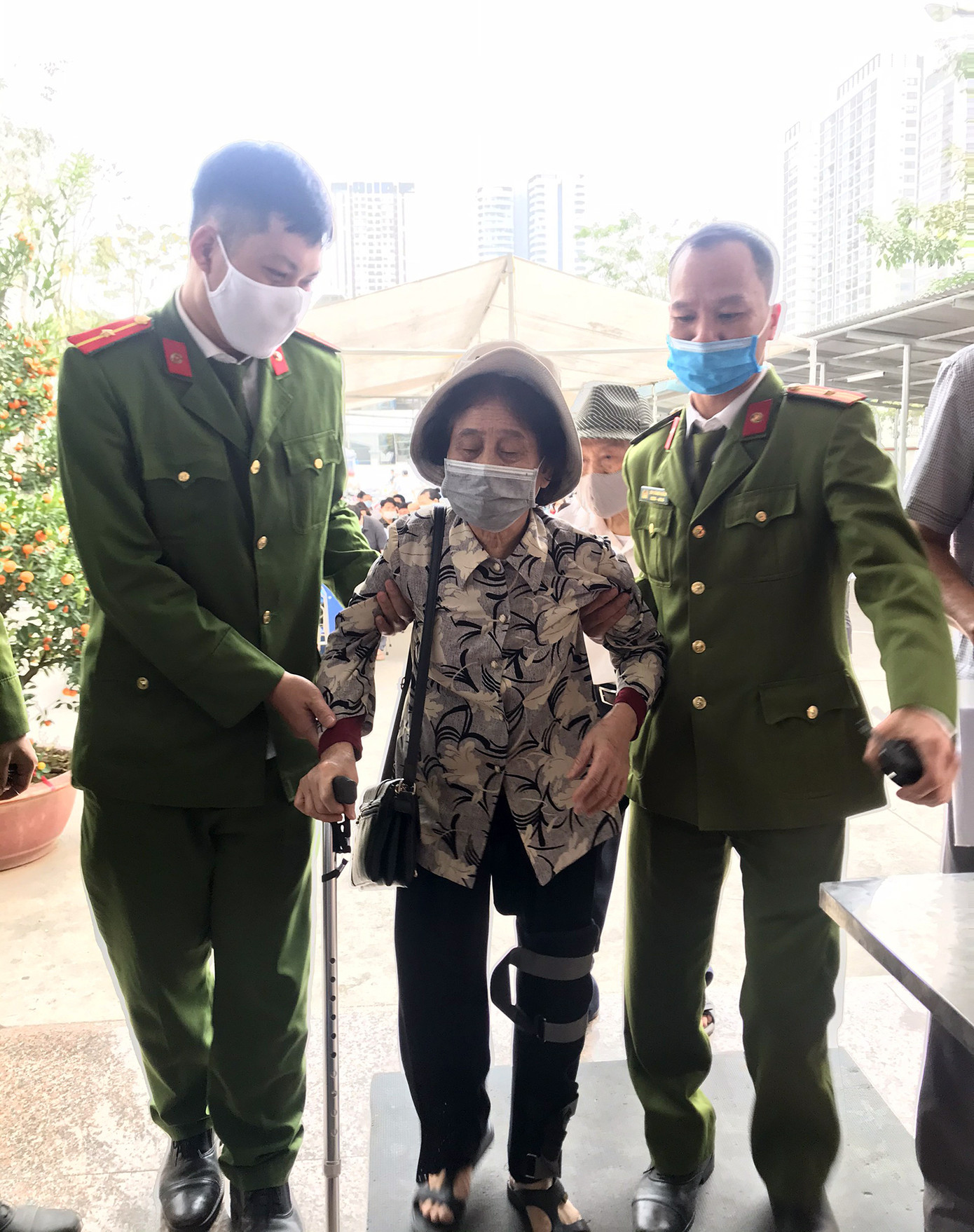 Trung úy Chu Minh Hưng - Đoàn viên thanh niên Đội Cảnh sát Phòng cháy và chữa cháy giúp đỡ cụ bà đến làm căn cước do tuổi cao đi lại khó khăn.
