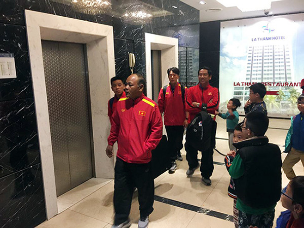 CĐV đứng trong khách sạn chờ đón tuyển Việt Nam từ chiều 15/12.