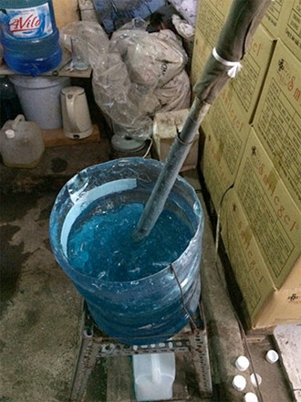 Việc pha chế theo quy trình rất đơn giản, chỉ cần lấy hóa chất pha với nước, sau đó dùng mô tơ quấy đều để ra sản phẩm gel màu xanh, đặc sệt dùng siêu âm cho các bệnh nhân.