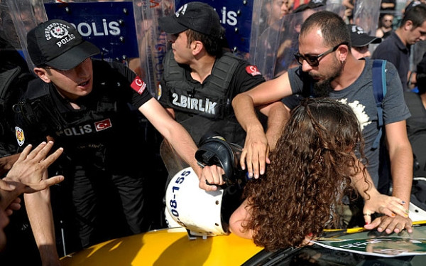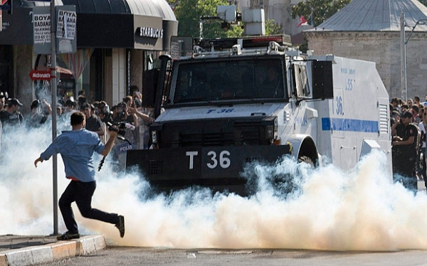 Báo điện tử sendika.org đưa tin, cảnh sát cũng sử dụng đạn cao su và bắt giữ một người biểu tình đứng trước một chiếc xe TOMA, loại thiết xa chuyên dụng của cảnh sát. Đám đông sử dụng còi để phản đối cảnh sát. Trong ảnh: Phó Chủ tịch Đảng Dân chủ Nhân dân, ông Mahmut Tanal đứng trên một thùng xe TOMA yêu cầu chấm cảnh sát chấm dứt đàn áp người đồng tính (Ảnh: Báo Thời đại).