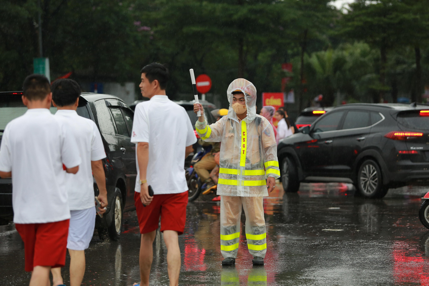 | Cảnh sát giao thông "đội mưa" làm nhiệm vụ. |