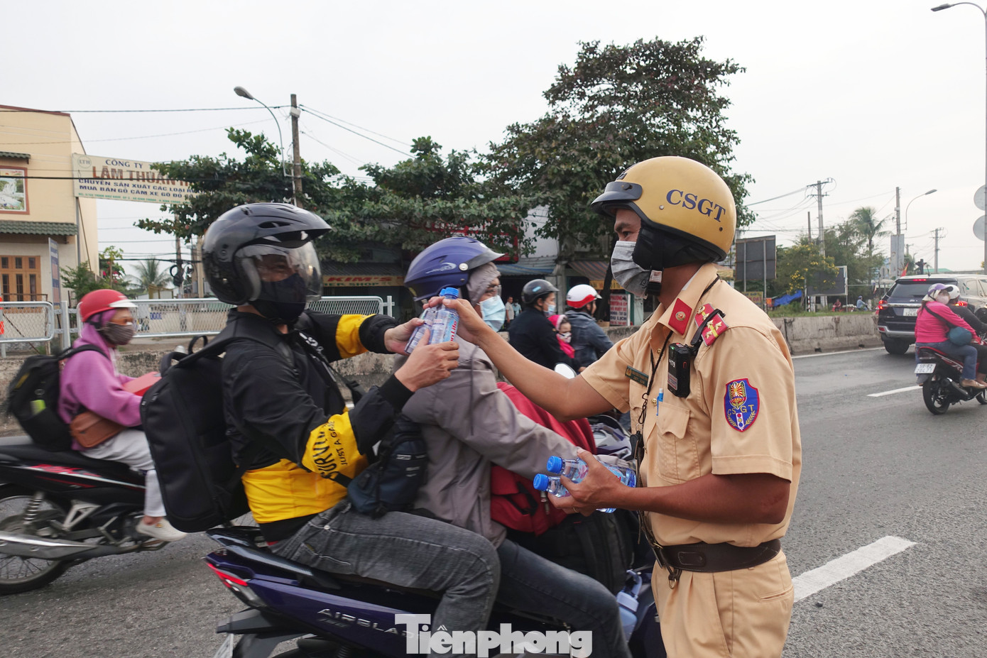 Sau khi giải thích việc đội mũ bảo hiểm kém chất lượng tiềm ẩn rủi ro, mất an toàn, cán bộ CSGT đã tặng mũ bảo hiểm mới cho vợ ông Phúc cùng nước uống, khăn lạnh.