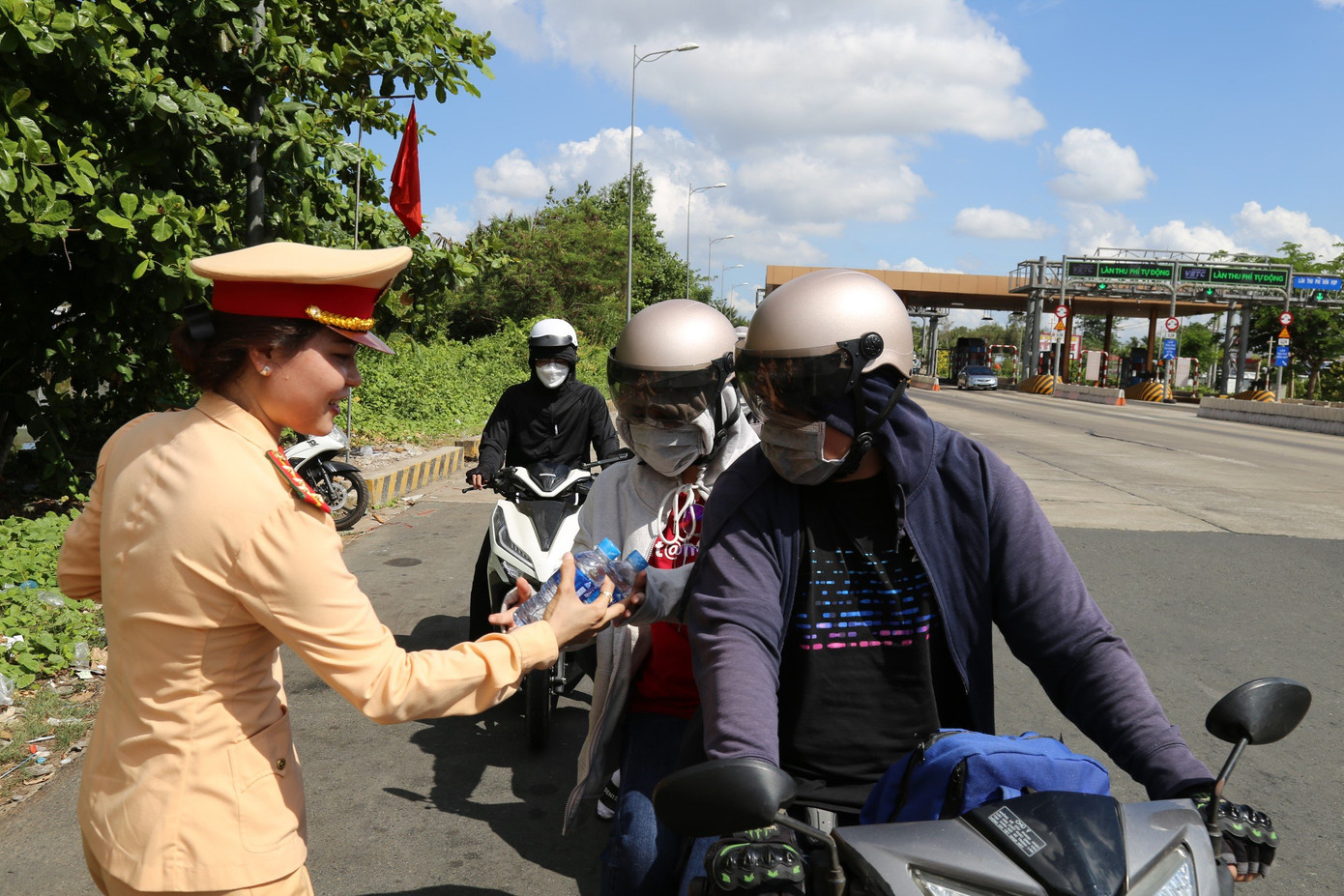 | Lực lượng CSGT phát nước cho người dân về quê nghỉ lễ. |