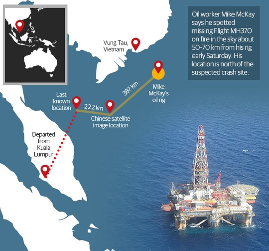 Trong khi giới chức Malaysia và cộng đồng quốc tế đang ráo riết truy tìm nguyên nhân chiếc Boeing 777-200 đột nhiên biến mất, một công nhân giàn khoan người New Zealand tên Mike McKay cho biết ông đã nhìn thấy một chiếc máy bay của hãng Malaysia Airlines bốc cháy vào sáng ngày 8-3.