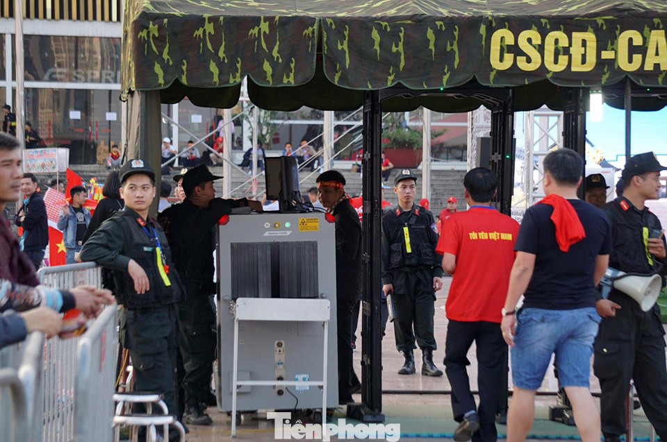 Ngoài 3 vòng kiểm soát an ninh trong sân bóng, Công an TP Hà Nội cũng bố trí nhiều vòng bảo vệ từ xa, dựng rào chắn hạn chế phương tiện, cấm đường. Người hâm mộ phải gửi xe và đi bộ quãng đường 400-500m tránh tình trạng ùn tắc, giao thông tê liệt.