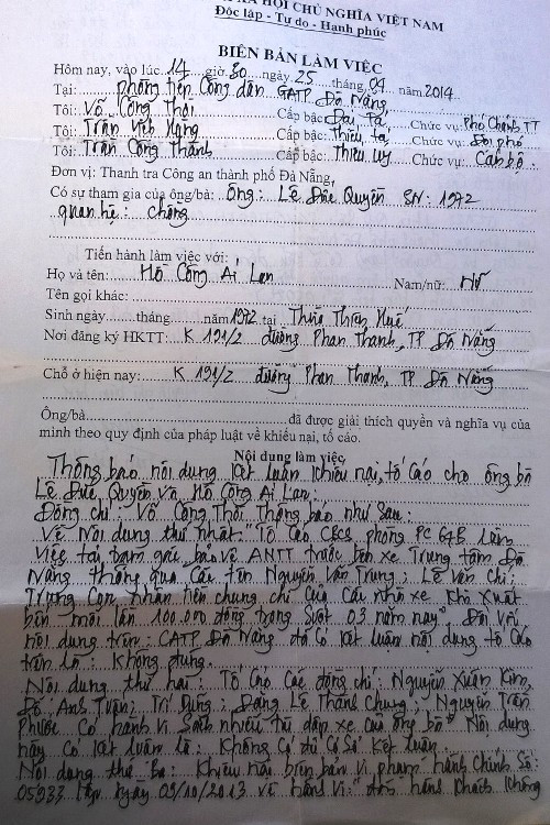 Theo bà Lan, việc các tổ Cảnh sát trật tự “làm căng” xe bà thời gian qua xuất phát từ việc bà Lan làm đơn tố cáo việc xe bà phải thường xuyên chung chi cho lực lượng chức năng khi rời bến. Tháng 4/2014, Thanh tra Công an TP.Đà Nẵng đã tiếp xúc, có biên bản làm việc giữa vợ chồng bà Lan và các bên liên quan. “Từ ngày đó, xe tôi mỗi khi xuất bến lúc nào cũng bị làm khó. Tôi kiến nghị lên cả giám đốc công an TP.Đà Nẵng nhưng không thấy trả lòi”, bà Lan nói.