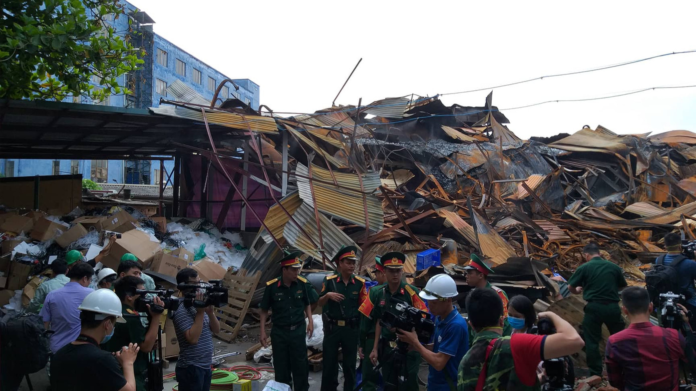 Tường xung quanh khu nhà xưởng bị phá để dập lửa trước đó.
