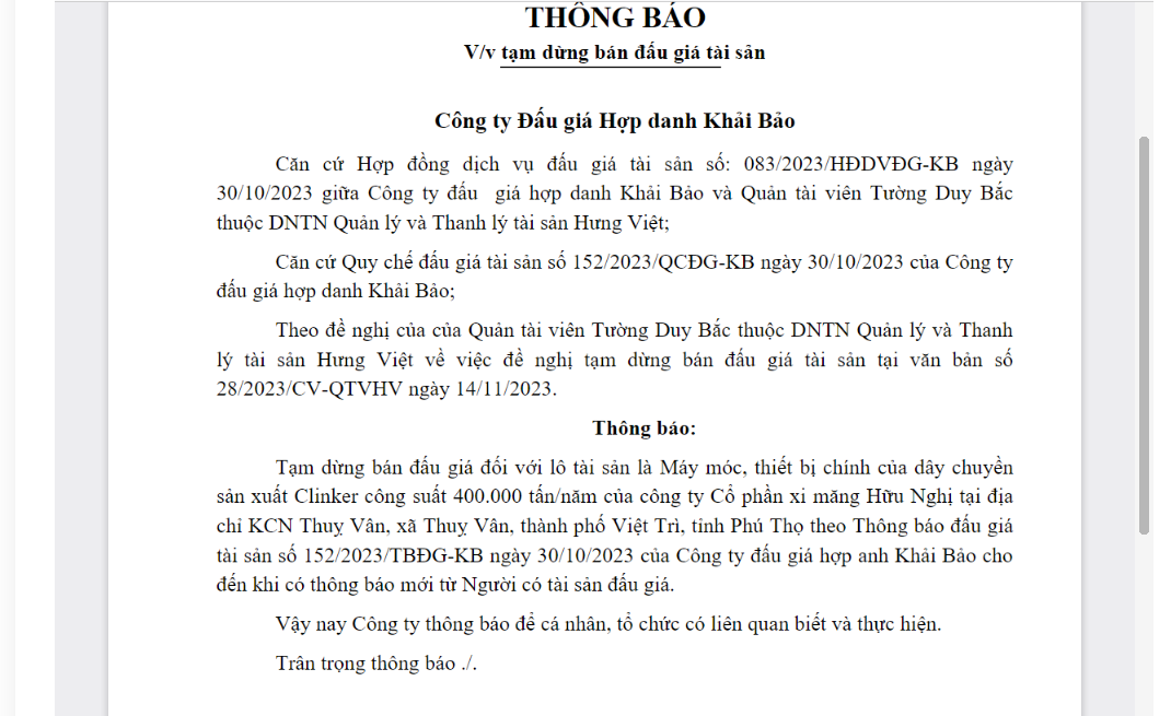 | Sau đó, ngày 30/10/2023, DNTN Hưng Việt và Công ty Đấu giá Hợp Danh Khải Bảo ký hợp đồng dịch vụ, đấu giá máy móc, thiết bị chính của dây chuyền sản xuất Clinker công suất 400.000 tấn/năm của Công ty Cổ phần xi măng Hữu Nghị. Thời gian đấu giá dự kiến là ngày 20/11/2023. |
