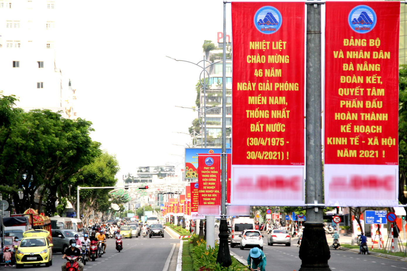 Các con đường lớn ở Đà Nẵng như Nguyễn Văn Linh, đường 2/9, đường Phạm Văn Đồng, đường Bạch Đằng, 30/4... cũng được "khoác áo mới" rực rỡ với những tấm pano chào mừng kỉ niệm 46 năm Giải phóng miền Nam, thống nhất đất nước.