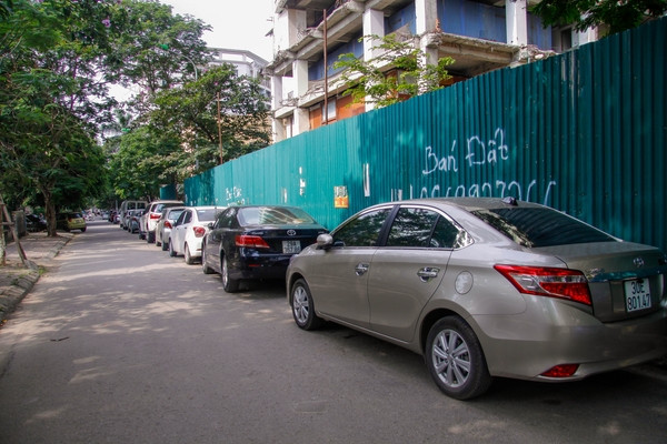 Khuôn viên của Dự án cũng được quây tôn kín và khóa chặt, đường đằng sau dự án được chiếm dũng làm chỗ đỗ xe.