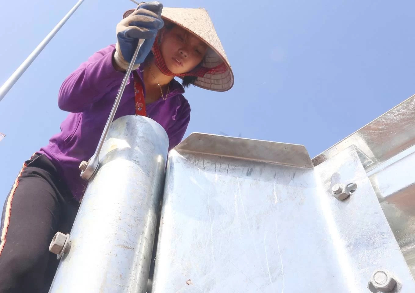 Chị Hoàng Thị Phan ở Nghĩa Lộ, Yên Bái, nhân công làm thuê cho nhà thầu phụ, đang lắp hàng rào hộ lan bằng thép. Để kịp thông xe kỹ thuật, chị Phan và nhóm công nhân phải làm xuyên trưa, có nhóm làm cả đêm.