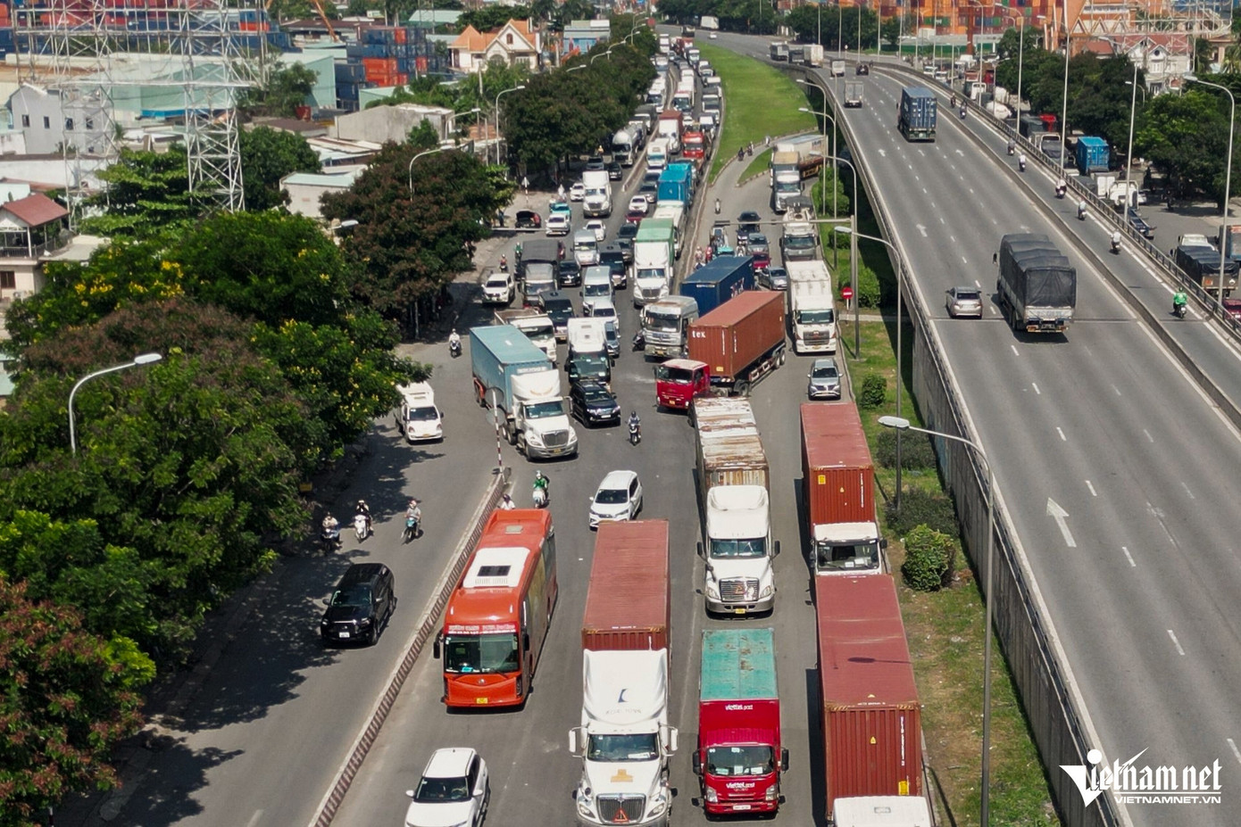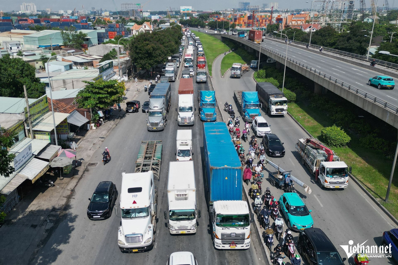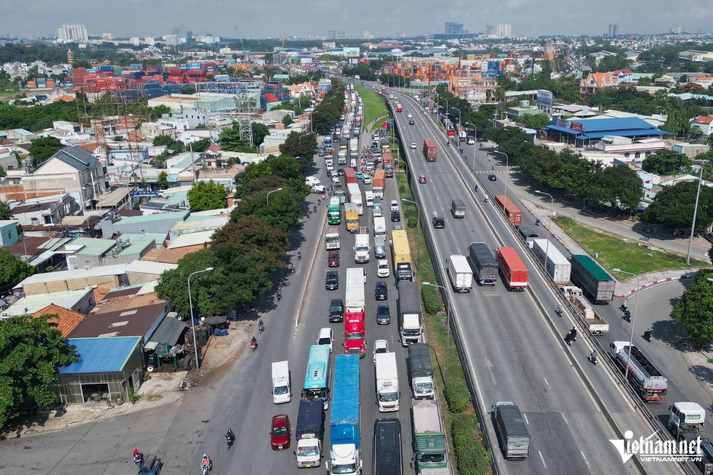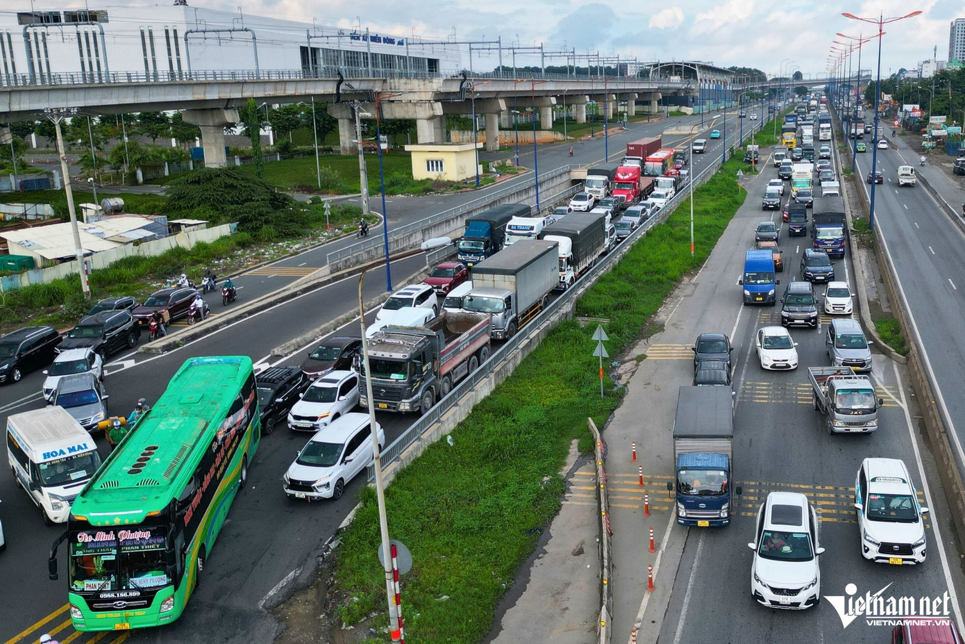 Theo ghi nhận của PV VietNamNet, số lượng phương tiện lưu thông trên quốc lộ 1 tăng cao dẫn đến tình trạng ùn tắc kéo dài. Điển hình là đoạn từ ngã ba Tân Vạn (TP Dĩ An, Bình Dương) đến bến xe Miền Đông mới (TPHCM). Nơi đây, các phương tiện nối đuôi, nhích từng mét rất khó khăn.