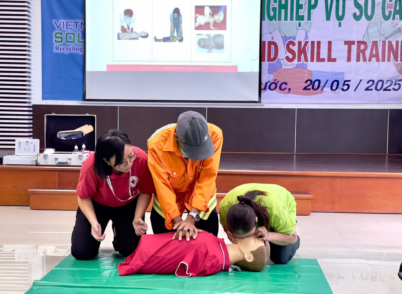 Nội dung khóa huấn luyện xoay quanh những kỹ năng sơ cấp cứu cơ bản và thường gặp trong môi trường lao động như: di chuyển nạn nhân khẩn cấp, sơ cứu dị vật đường thở, xử lý ngưng tim – ngưng thở, chảy máu, sốc, điện giật, té ngã gây gãy xương, bỏng và các tai nạn do hóa chất… Các học viên được thực hành trên mô hình mô phỏng, qua đó rèn luyện kỹ năng xử lý nhanh, đúng kỹ thuật trong những “phút vàng” đầu tiên – yếu tố quyết định hiệu quả cứu người trong thực tế.
