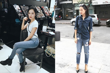 Người đẹp diện quần jeans với tần suất dày đặc vì tính hữu dụng của sản phẩm trong quá trình vận động. Công thức mix đồ được Hạ Vy chuộng nhất là denim-on-denim với cách hạ tông màu để nhấn nhá. Cô cũng ưu ái với các thiết kế jeans rách.