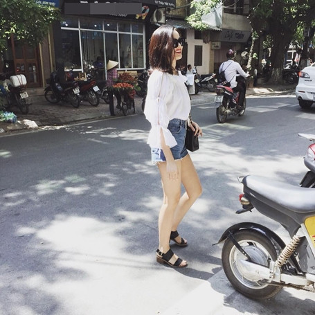 Cách mix đồ đơn giản còn được cô áp dụng cùng quần short bò, kết hợp cùng dép xăng đan đế thấp rất trendy.