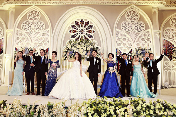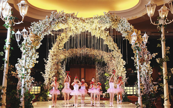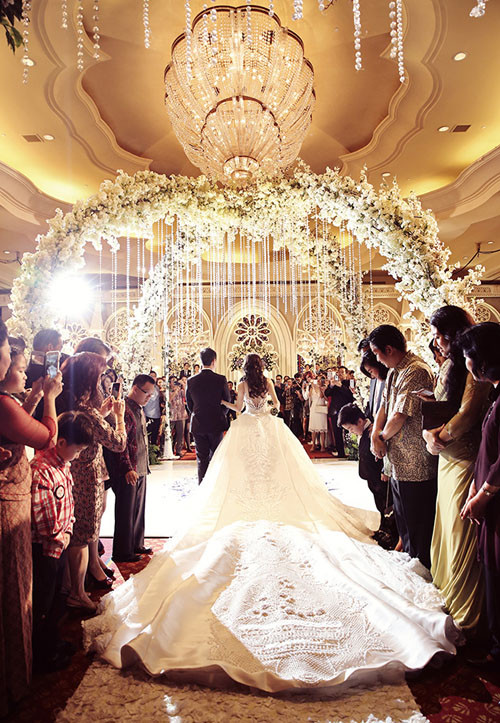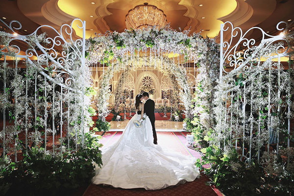 Cổng đón khách cao gần 4m mang đến hơi thở cổ tích cho tiệc cưới. Các vị khách dự tiệc cưới đều được tặng những món quà đắt tiền, đặc biệt hơn, cô dâu và chú rể kỳ công lên thực đơn riêng cho từng vị khách dựa trên thói quen, sở thích, văn hóa.