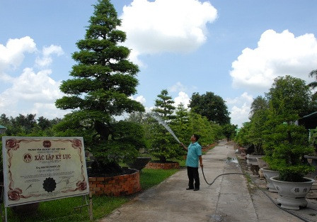 Ông Phước Lộc đứng giữa cặp me đã được Trung tâm Sách kỷ lục Việt Nam xác lập là cặp me kiểng cổ nhất Việt Nam