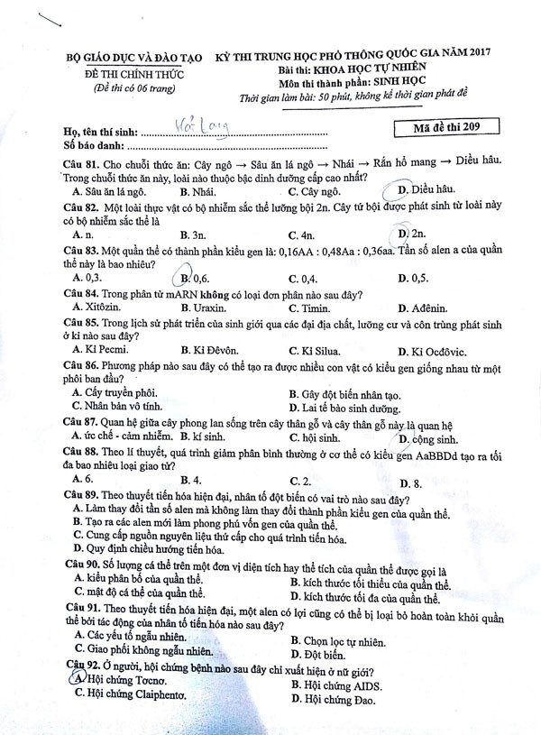 - Về phạm vi đề thi: Nội dung đề thi hầu hết nằm trong chương trình Sinh học lớp 12 nhưng cũng có câu hỏi có liên hệ với kiến thức lớp 10 (Ví dụ như câu 88 mã 209). Kiến thức phủ nội dung chương trình và phân bổ tương đối đồng đều giữa các chuyên đề, có sự sắp xếp theo vùng từ dễ đến khó ở mức tương đối. Cách phân bổ và sắp xếp như vậy cũng tạo tâm lí thoải mái và thuận lợi cho các em học sinh làm bài. Nhìn chung, phạm vi đề thi thi THPT quốc gia môn Sinh học năm 2017 tương đối phù hợp với hình thức đề thi minh họa, thử nghiệm và đề thi tham khảo mà Bộ đã công bố.