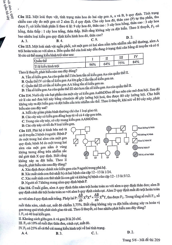 5. Ở các câu hỏi mang tính phân loại cao, dạng thức và cách ra đề không có nhiều điểm đổi mới so với đề thi minh họa, tham khảo, thử nghiệm của Bộ. Ví dụ các câu phả hệ trong các mã đề đều có hình thức tương đối quan thuộc với hầu hết các thí sinh.