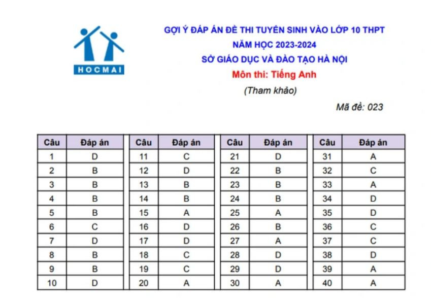 TPO - Tiền Phong giới thiệu đáp án gợi ý môn tiếng Anh vào lớp 10 tại Hà Nội năm 2023.