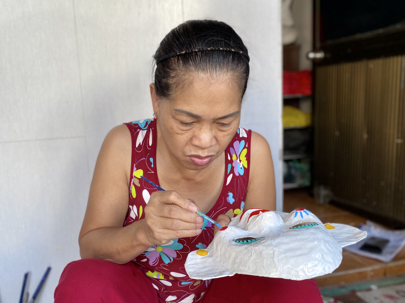 Sau khi bồi xong, mặt nạ được hong khô ngay trên hiên nhà, đến lúc bề mặt ráo vừa độ thì chuyển sang khâu trang trí. Với khoảng chục cây cọ và vài màu sơn cơ bản, bà Lan “thổi hồn” vào từng chiếc mặt nạ. Bà Lan giới thiệu: “Mặt nạ có 2 dòng chính là mặt người và mặt thú, gồm các nhân vật như Chí Phèo, chú Tễu, siêu nhân, thỏ, hổ, sư tử, …”