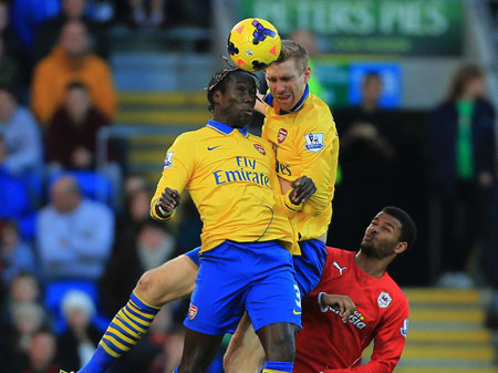 Phút thứ 18, đón đường chuyền bổng từ cánh phải của đồng đội, Turner (6-Cardiff) bật rất cao, đưa bóng đi vọt xà ngang khung thành Arsenal.