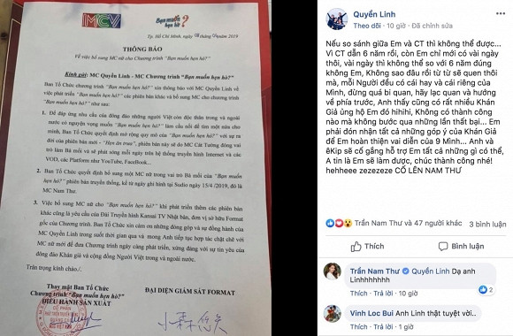 Vụ việc Nam Thư thay Cát Tường dẫn chương trình “Bạn muốn hẹn hò” đang là đề tài thu hút sự quan tâm lớn của dư luận, đặc biệt là mới đây MC Quyền Linh đã lên tiếng bênh vực Nam Thư trên trang cá nhân và đồng thời đính kèm bản thông báo từ phía nhà sản xuất về lý do Cát Tường không tiếp tục vai trò "bà mối”. Theo hình ảnh được đăng tải, ban tổ chức “Bạn muốn hẹn hò” muốn mở rộng quy mô chương trình nên cho ra đời phiên bản mới có tên gọi “Hẹn ăn trưa” do Cát Tường làm MC.