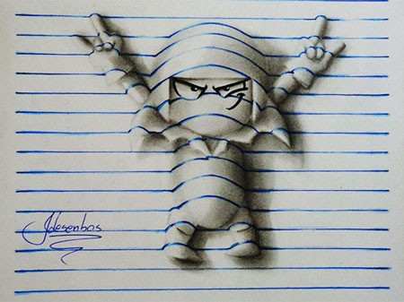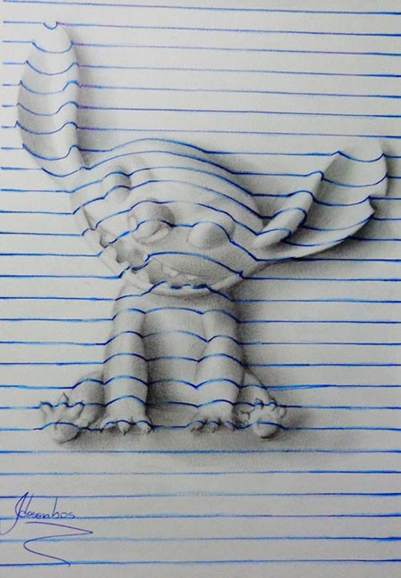 Carvalho “uốn cong” những đường kẻ xanh trên trang giấy, và sau đó bổ sung thêm những vùng tối, để hoàn thành bản vẽ của mình. Các nhân vật, đồ vật dường như nhảy bật ra khỏi trang giấy, hoặc thậm chí "chạy" xuyên từ trang này sang trang khác.
