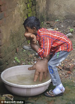 Hằng ngày, ông Shamim phải giúp đỡ con mình ăn vì tay của cậu bé không thể cầm nắm những vật nhỏ. Chỉ với 2 ngón tay, việc đơn giản cậu có thể làm là cầm được một ly nước nhưng vẫn gặp rất nhiều khó khăn.