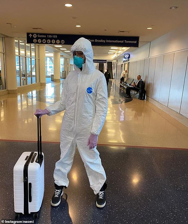 Mới đây, nàng "báo đen" mặc bộ đồ bảo hộ kín mít từ đầu đến chân ở sân bay khiến người hâm mộ gọi Naomi Campbell là "nữ hoàng phòng chống dịch bệnh".