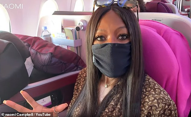 Siêu mẫu huyền thoại Naomi Campbell đeo khẩu trang trên máy bay.