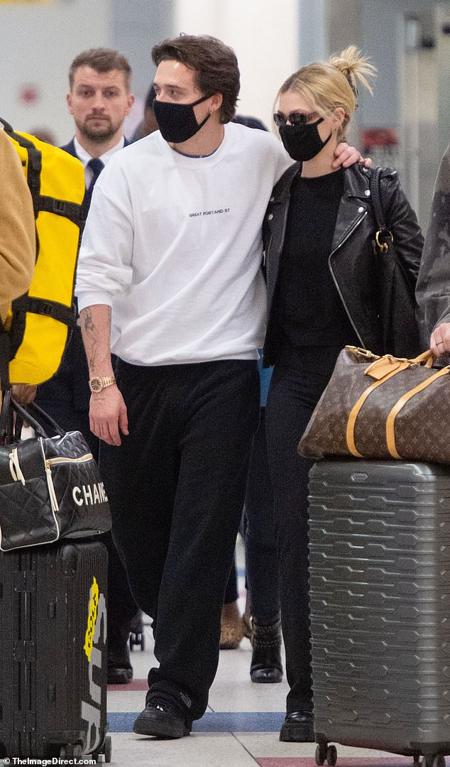 Brooklyn và bạn gái Nicola Peltz đeo khẩu trang đôi màu đen ở sân bay JFK, New York vào hôm qua.
