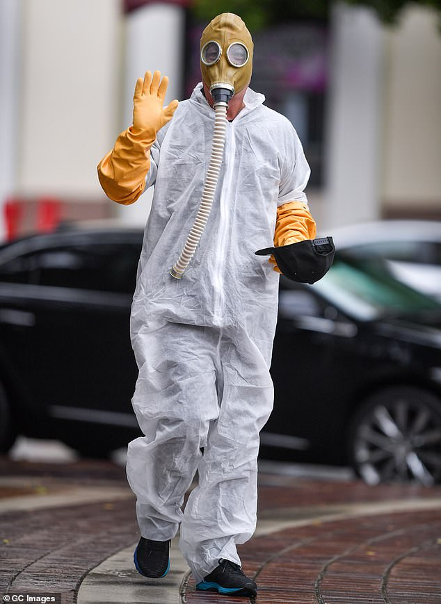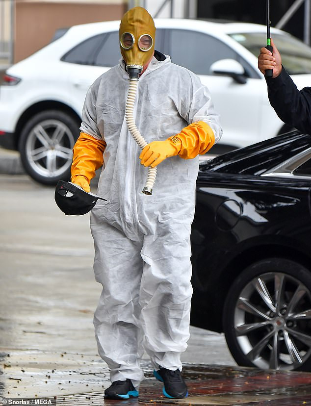 Giám khảo America's Got Talent Howie Mandel mặc kín bưng với trang phục bảo hộ, đeo găng tay và mặt nạ phòng độc khi tới trường quay vào hôm qua.