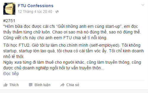 "Tôi học FTU2. Giờ tôi tự làm cho chính mình (self-employed). Tôi không startup, startup lớn lao quá, tôi chưa có cái tầm vóc ấy. Tôi chỉ kinh doanh nhỏ lẻ thôi.