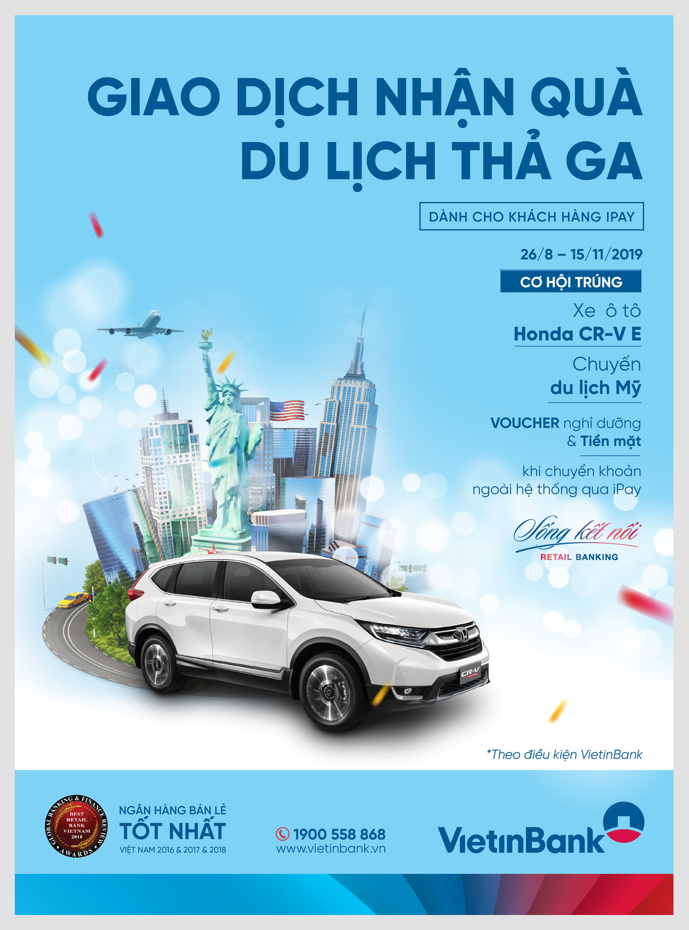 Đặc biệt, đối với mỗi giao dịch chuyển tiền liên ngân hàng (có tính phí), Mẹ sẽ có cơ hội nhận được vô vàn giải thưởng hấp dẫn từ VietinBank. Cụ thể từ ngày 26/8/2019 - 15/11/2019, VietinBank triển khai Chương trình khuyến mãi (CTKM) dành cho khách hàng. Theo đó, khi có 5 giao dịch chuyển khoản liên ngân hàng qua ứng dụng VietinBank iPay Mobile, khách hàng sẽ nhận được 1 mã dự thưởng để tham gia quay số may mắn với nhiều giải thưởng có giá trị. Giải đặc biệt là 1 ô tô Honda CR-V 1.5 E phiên bản 2019, 2 giải Nhất là chuyến đi du lịch Mỹ dành cho 2 người cùng nhiều phần quà hấp dẫn khác.
