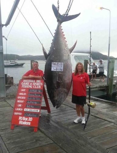 Bà Donna Pascoe, 56 tuổi đã trở nên nổi tiếng sau khi câu được thủy quái "khủng" là một con cá ngừ vây xanh Thái Bình Dương nặng tới 411,6kg, dài 3m ở đảo Three Kings, New Zealand.