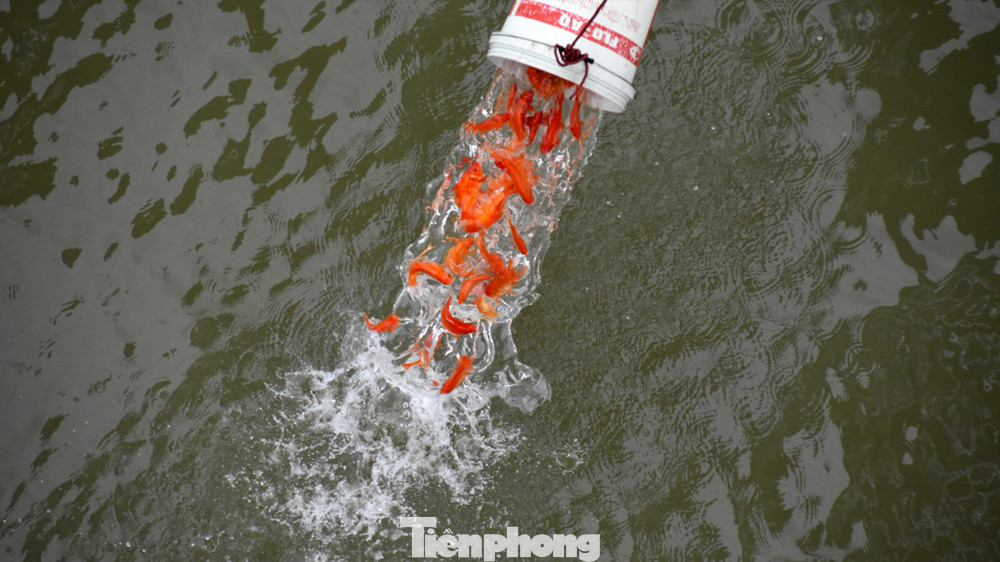 Cá chép vàng của người dân được các bạn tình nguyện viên thả giúp bằng cách cho vào xô rồi dòng dây xuống gần mặt nước mới đổ xuống, tránh tình trạng người dân quăng cả túi cá từ mặt cầu xuống sông Hồng.