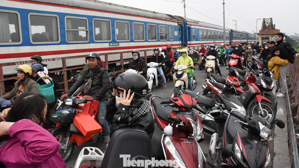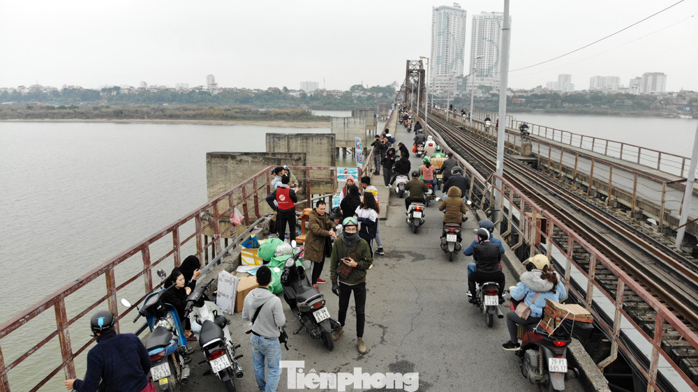 Nhiều phương tiện dừng đỗ trên cầu Long Biên để thực hiện nghi thức thả cá chép.