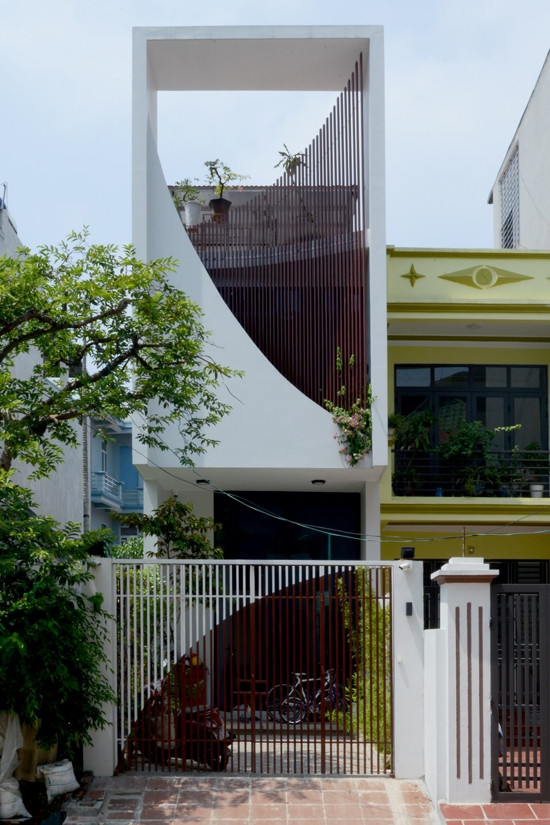 Căn nhà 3 tầng xây trên miếng đất 4 x 22 m tại thành phố Vĩnh Yên, Vĩnh Phúc là tổ ấm của một cặp vợ chồng trẻ và hai con nhỏ. Để tránh nắng hướng Tây Nam, mặt tiền hai tầng trên được xử lý bằng một mảng tường trắng đan xen với lam sắt cong cong, vừa tạo hiệu ứng thẩm mỹ từ bên ngoài, vừa làm bóng đổ cho không gian bên trong.