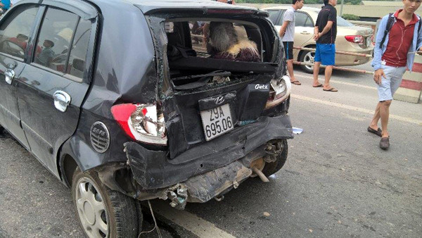 Cú thúc mạnh giữa xe tải và xe khách còn làm 4 xe con chạy phía trước bị “dồn toa”.