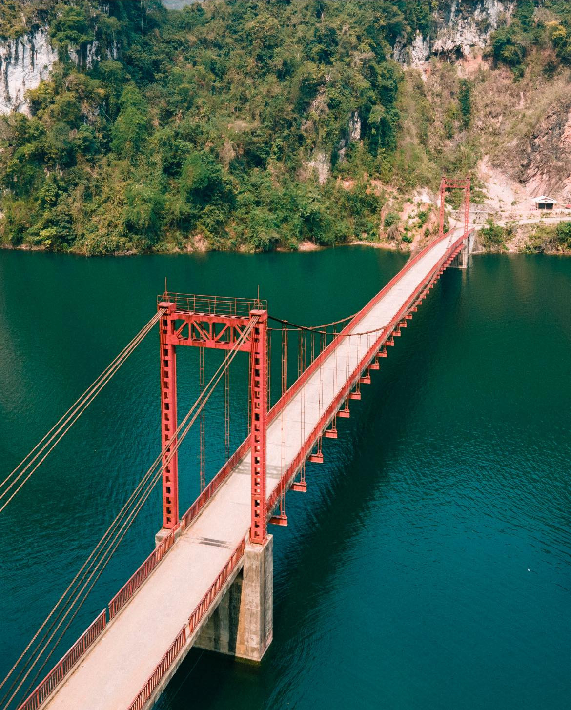 | Cầu treo Pa Phông nhìn từ trên cao. Chiếc cầu nổi bật giữa màu xanh của sông nước, của núi rừng và bầu trời |