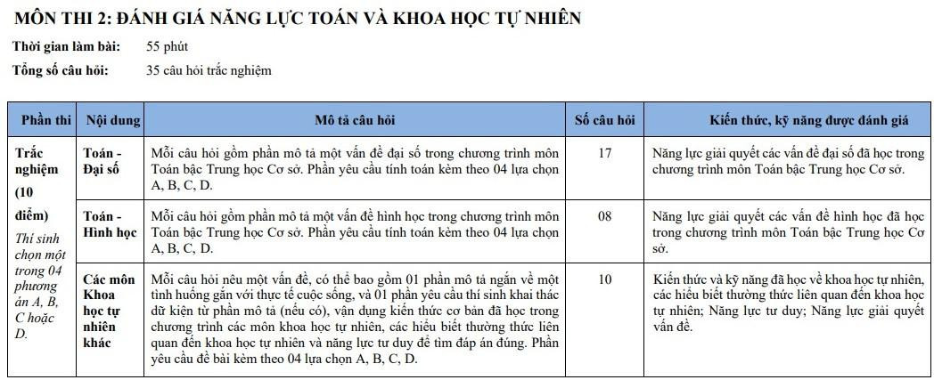Ở môn thi 2 là Đánh giá năng lực Toán và Khoa học tự nhiên, gồm 35 câu hỏi trắc nghiệm, thời gian làm bài 55 phút.