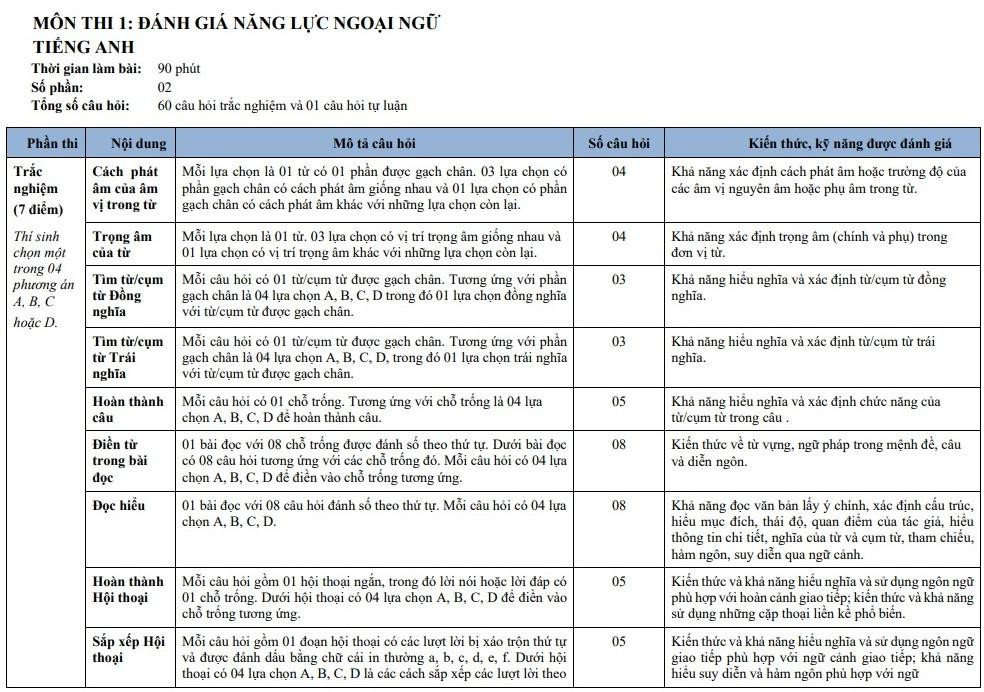 Theo công bố của trường, môn thi 1 là Đánh giá năng lực ngoại ngữ với 2 phần, thời gian làm bài 90 phút, gồm 60 câu hỏi trắc nghiệm và 1 câu tự luận. Môn thi 1 có thể là tiếng Anh hoặc ngoại ngữ khác.