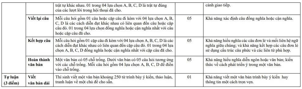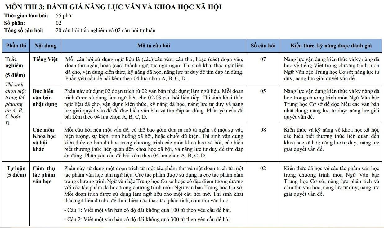Ở môn thi 3 là Đánh giá năng lực Văn và Khoa học xã hội, gồm 2 phần với 20 câu hỏi trắc nghiệm và 2 câu hỏi tự luận, thời gian làm bài 55 phút.