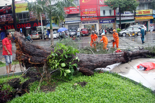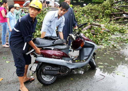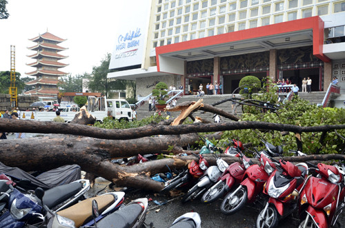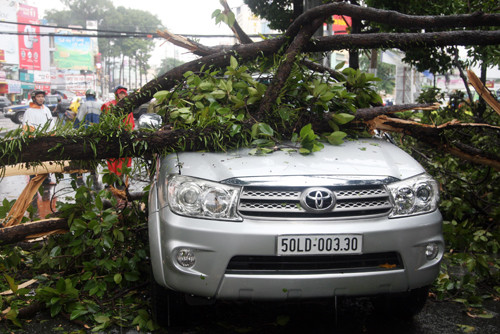 Khoảng 14h30, cơn mưa lớn kèm theo giông mạnh lướt qua nhiều quận trung tâm TP HCM. Một nhánh cổ thụ bị tét đè bẹp nóc ôtô 7 chỗ trên đường Hùng Vương, đoạn gần vòng xoay Lý Thái Tổ (quận 5). Không có thương vong nhưng tuyến đường bị phong tỏa.