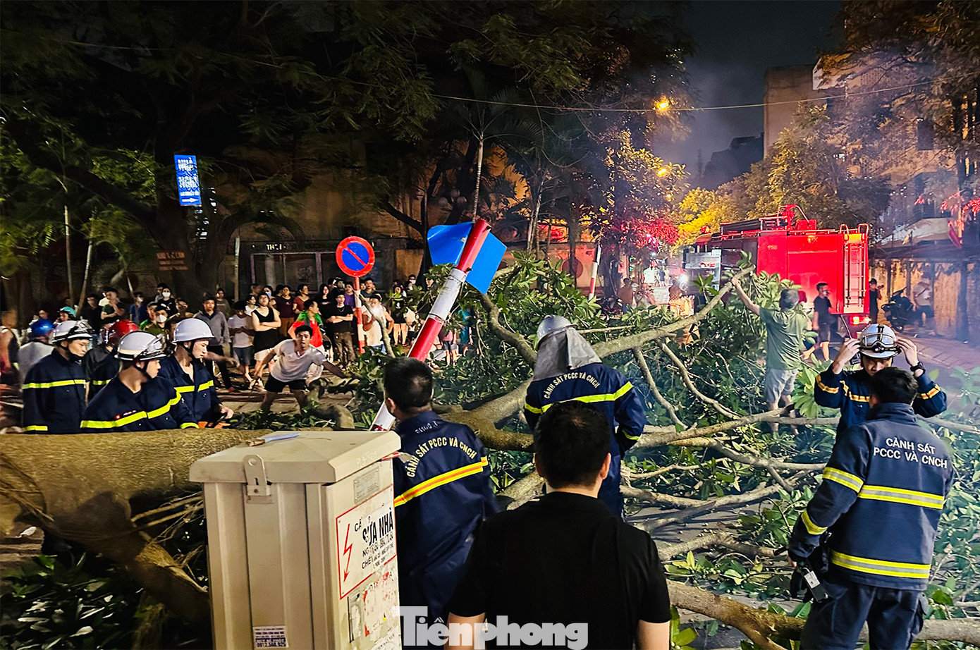 | Lực lượng Cảnh sát PCCC của quận Thanh Xuân cắt bỏ, đưa nhánh cây bị gẫy ra khỏi hiện trường. |
