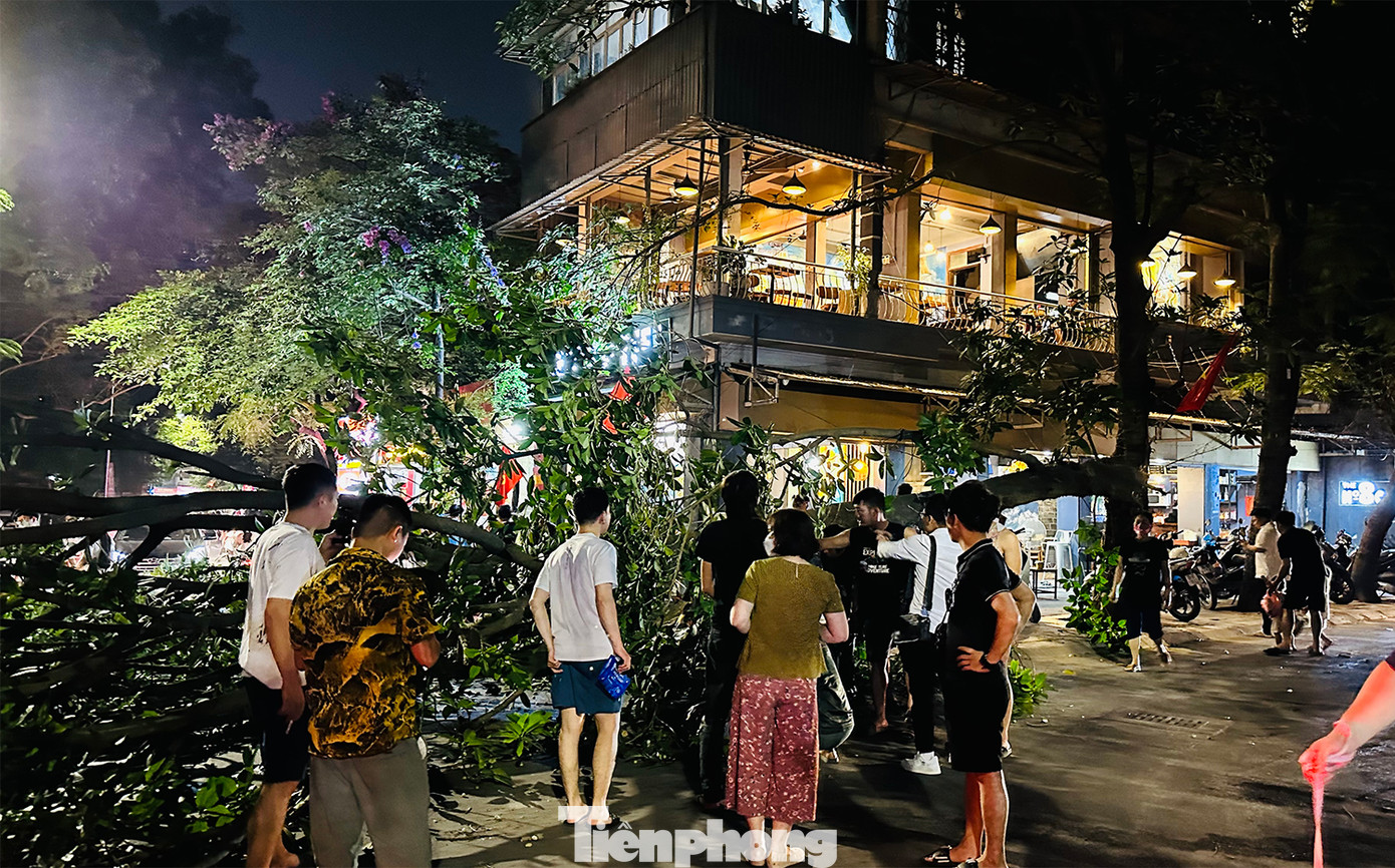 | Chị Nhung, ngồi uống cà phê trước cửa nhà, cho biết: "Tôi đang ngồi bỗng nghe tiếng kêu rắc rắc, ngay sau đó thấy cả cành cây to đổ từ từ xuống chắn ngang đường, thấy 2 vợ chồng cùng một cháu bé đi ngang qua đường lúc đó, người chồng bị cành cây đè lên bị thương nhẹ". |