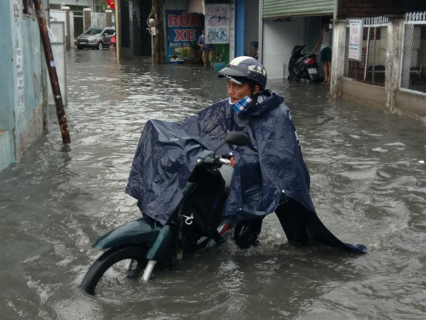 Mưa kéo dài kèm theo gió mạnh khiến nhiều tuyến đường ngập nặng, nước chảy như thác khiến người tham gia giao thông gặp rất nhiều khó khăn.